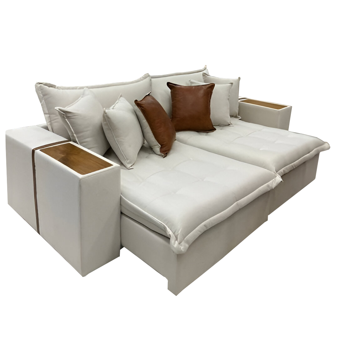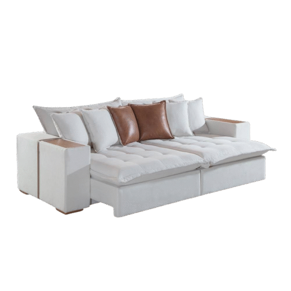 Sofá Cama Tebas 2,32 m Linho Marfim 12/Corino Dallas 07 – INNOVE ESTOFADOS
