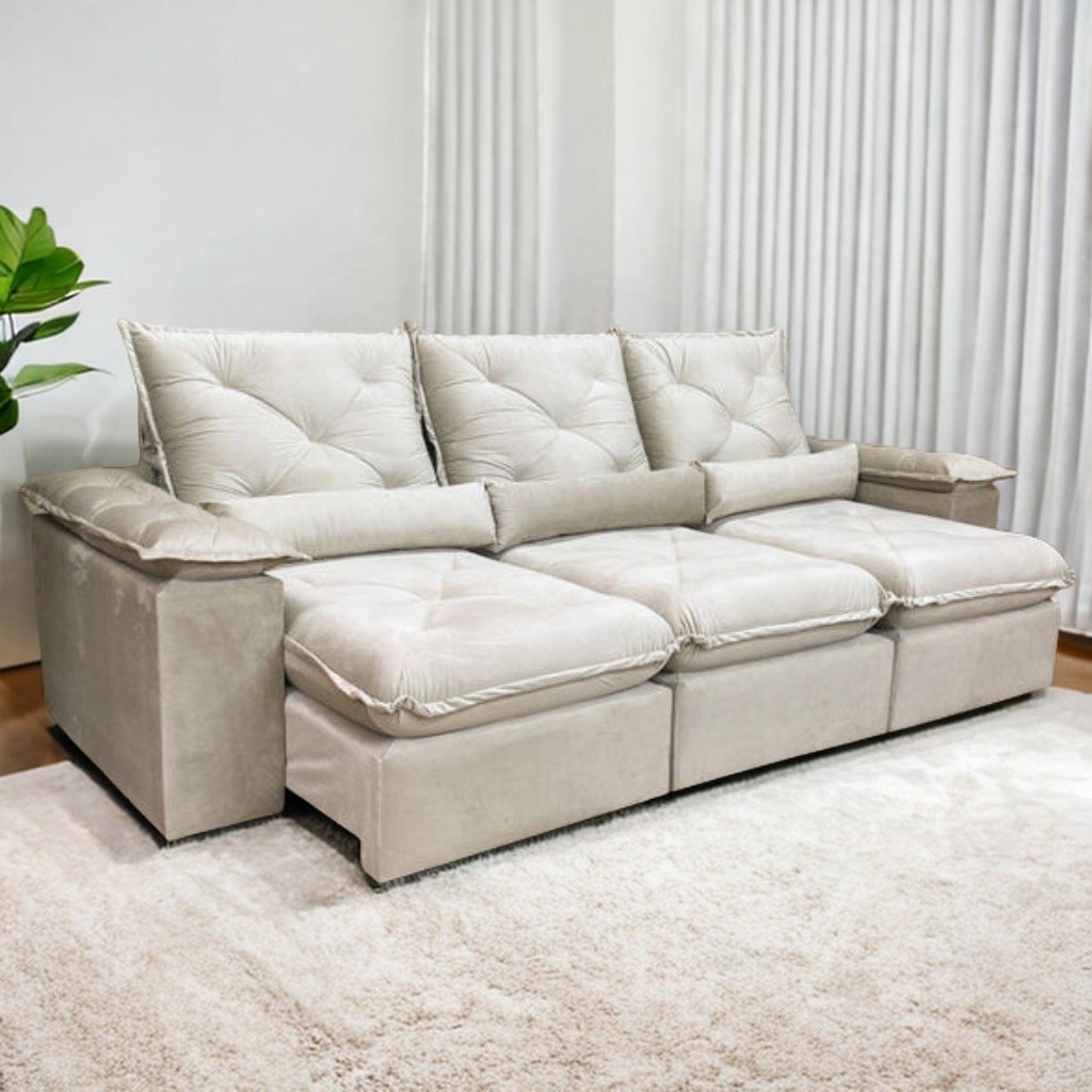Sofá Retrátil e Reclinável Brasão 2,70 m Veludo Bege – MD ESTOFADOS